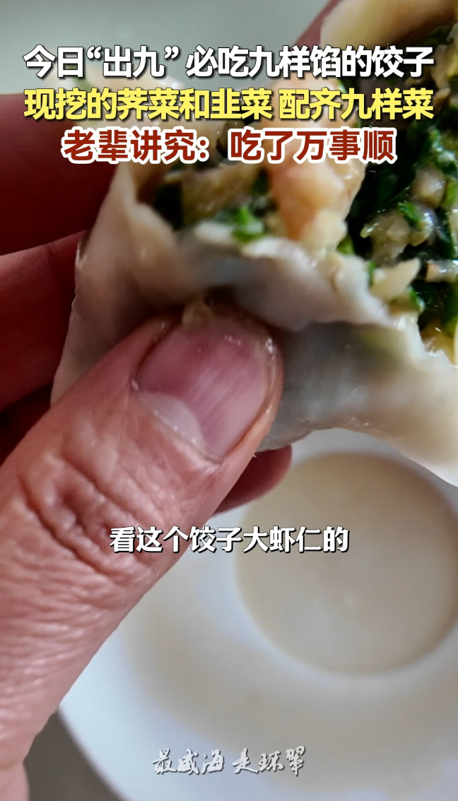 “出九”吃九样馅饺子,吃了万事顺大众新闻 | 昨天17:03 原创大众新闻 微信扫码扫码下载客户端按照冬至开始数九的传统,3月11日,农历正月二十三,数九结束。按照威海习俗,要把现挖的荠菜和韭菜等配齐九样菜,包九样馅的饺子。老辈讲究:吃了九样饺,新年万事顺。(大众新闻记者 郑莉 通讯员 姜渝群)