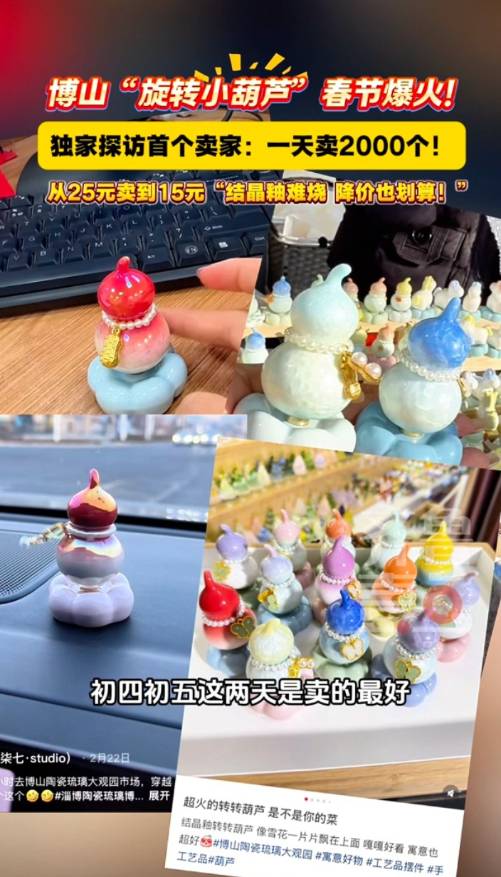 博山“旋转小葫芦”春节爆火,记者独家探访大观园首个卖家大众报业·齐鲁壹点 昨天17:10博山“旋转小葫芦”春节爆火,记者独家探访大观园首个卖家:初四初五一天卖出2000个!从25元卖到15元,结晶釉难烧,就算降价也划算。