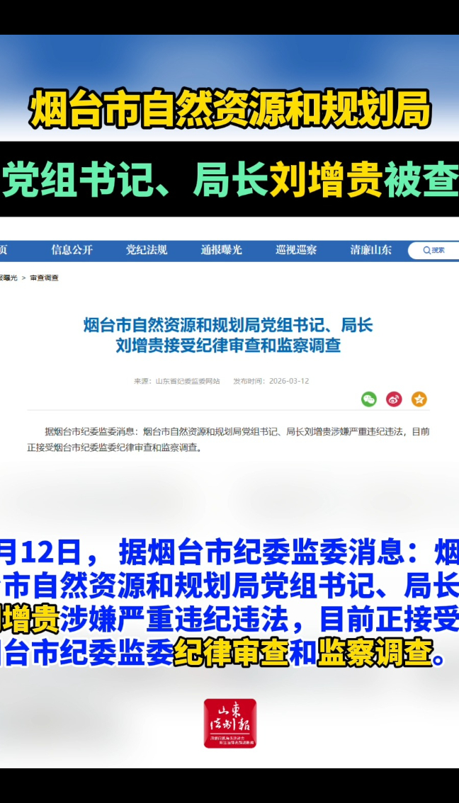 烟台市自然资源和规划局党组书记、局长刘增贵被查山东法制报 | 昨天20:16 山东省纪委监委网站 微信扫码扫码下载客户端3月12日,据烟台市纪委监委消息:烟台市自然资源和规划局党组书记、局长刘增贵涉嫌严重违纪违法,目前正接受烟台市纪委监委纪律审查和监察调查。