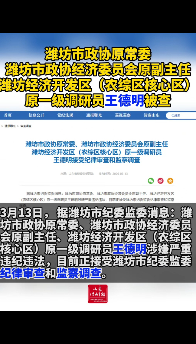 潍坊市政协原常委、潍坊市政协经济委员会原副主任、潍坊经济开发区(农综区核心区)原一级调研员王德明被查山东法制报 | 昨天20:02 山东省纪委监委网站 微信扫码扫码下载客户端3月13日,据潍坊市纪委监委消息:潍坊市政协原常委、潍坊市政协经济委员会原副主任、潍坊经济开发区(农综区核心区)原一级调研员王德明涉嫌严重违纪违法,目前正接受潍坊市纪委监委纪律审查和监察调查。