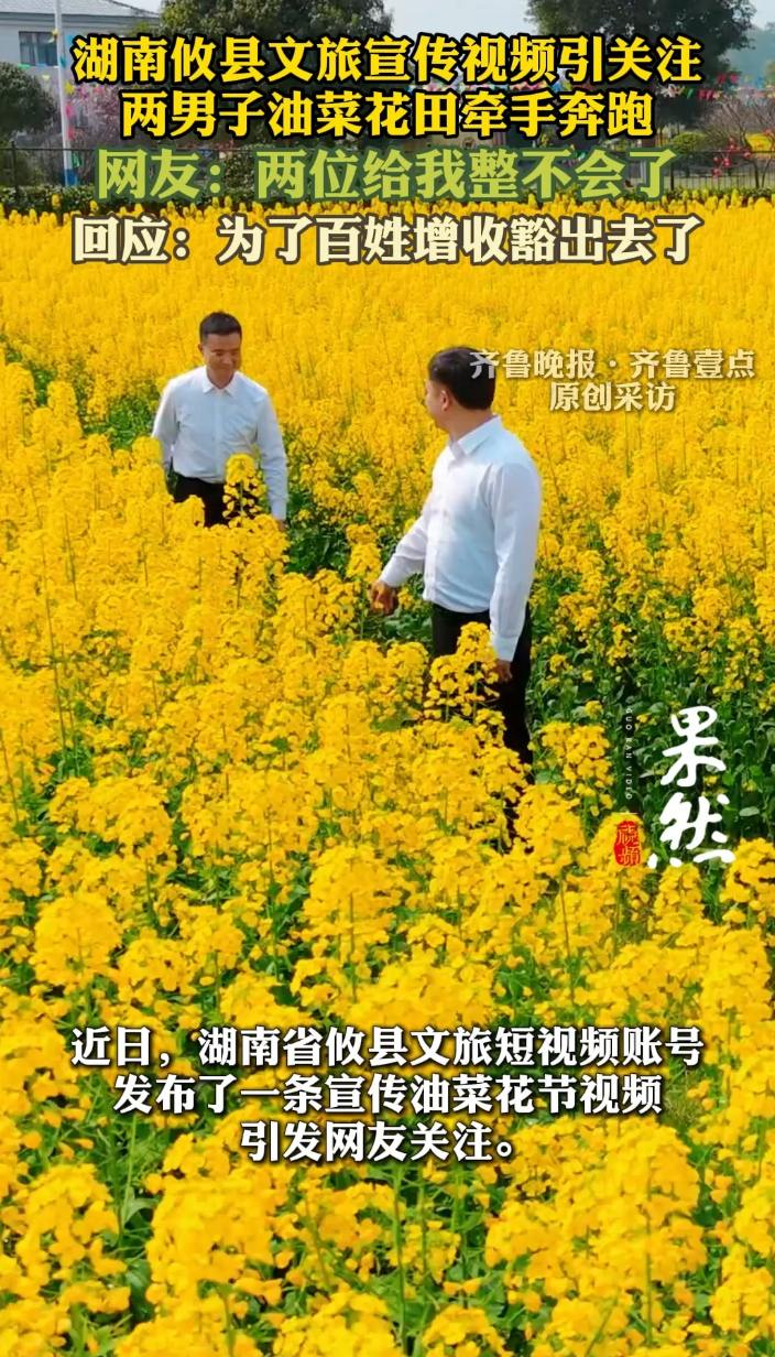 果然视频|两个大男人在花田牵手跑,攸县文旅把网友整不会了齐鲁晚报·齐鲁壹点客户端 昨天17:59原创齐鲁晚报·齐鲁壹点 徐宁 近日,湖南攸县文旅短视频账号发布的一条宣传视频引发网友关注。视频中,两名男子牵手在油菜花田中奔跑,配以浪漫音乐,网友留言称"两位领导给我整不会了"。3月13日,齐鲁晚报·齐鲁壹点记者采访了宁家坪镇政府工作人员。据其介绍,出镜人员为攸县文旅局党组书记兼局长,视频创意由县里统一策划。他同时强调,当地领导出镜的初心是"让活动搞得更红火,让当地百姓能增收"。