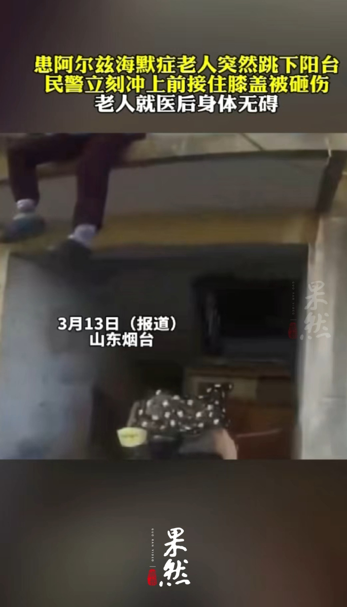 果然视频|患阿尔兹海默症老人突然跳下阳台,民警立刻冲上前接住齐鲁晚报·齐鲁壹点客户端 昨天17:26原创“我们找梯子过来!”话还没说完,老人突然从阳台跳下。3月13日(报道),在山东烟台,一名患阿尔兹海默症的老人突发险情。千钧一发之际,民警姜聪来不及多想,立刻冲上前用身体硬生生接住老人。老人安然无恙,姜聪的膝盖却被砸伤。事后他说:“那一瞬间,只想接住她。”(齐鲁晚报·齐鲁壹点记者 刘一诺 孔明哲 范佳)