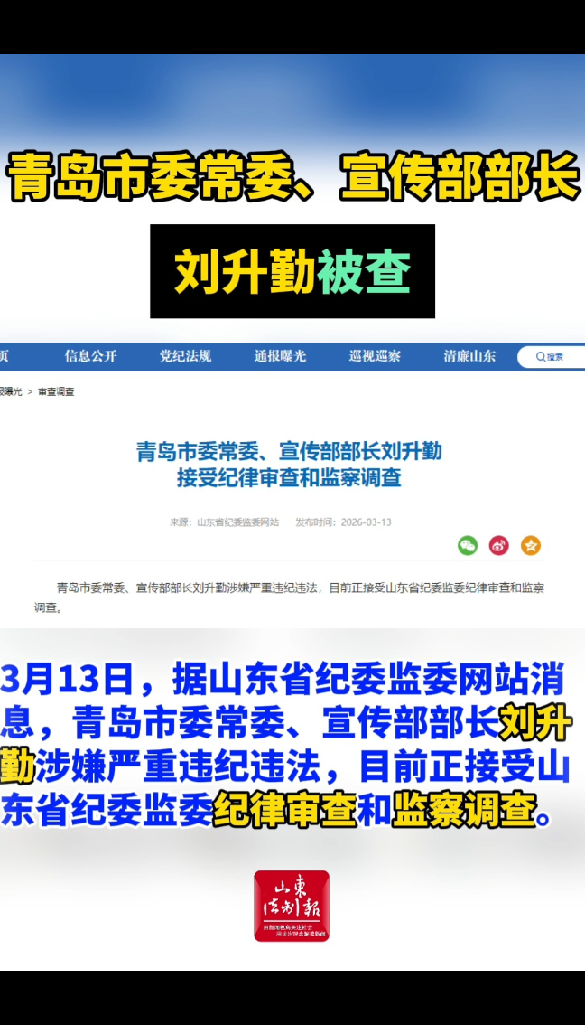 青岛市委常委、宣传部部长刘升勤被查山东法制报 | 昨天20:13 山东省纪委监委网站 微信扫码扫码下载客户端3月13日,据山东省纪委监委网站消息,青岛市委常委、宣传部部长刘升勤涉嫌严重违纪违法,目前正接受山东省纪委监委纪律审查和监察调查。