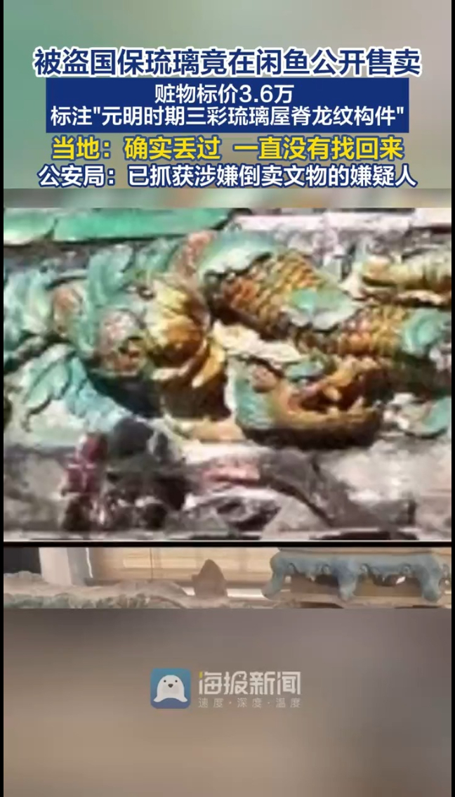 被盗国保琉璃竟在闲鱼公开售卖!赃物标价3.6万,目前嫌疑人已被抓获。近日,一套疑似来自全国重点文物保护单位夏禹神祠的“元明时期三彩琉璃屋脊龙纹构件”,竟然直接出现在了闲鱼平台上叫卖,标价高达36666元,描述里还写着“适合古建收藏、摆件”。