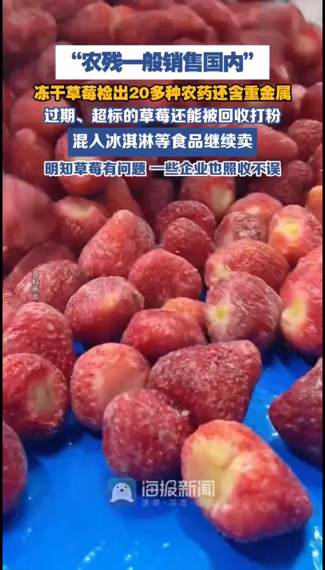 你吃的冻干草莓,可能是“毒水果”!福建一家企业自查发现,手里的冻干草莓镉含量高达0.728mg/kg,还同时检出20多种超范围农药。举报后,却因为“国标没有冻干草莓镉限量标准”立不了案,这遮羞布一扯,全是问题。