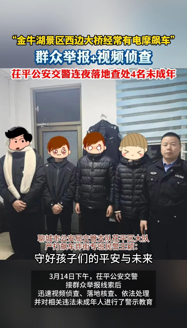 群众举报+视频侦查!茌平依法查处4名电摩飙车未成年大众新闻 03-14原创3月14日下午,茌平公安交警接群众举报称,金牛湖景区西边大桥有电摩飙车,经迅速侦查,依法查处4名未成年。(大众新闻记者 孙亚飞 李怀磊)