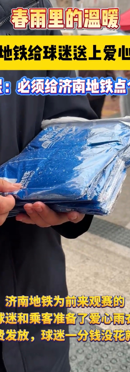春雨里的温暖,济南地铁给球迷送上雨衣 球迷:给济南地铁点赞大众报业·齐鲁壹点 03-14中超春晚遇上春雨绵绵,山东泰山对阵北京国安,济南地铁为前来观赛的球迷和乘客准备了爱心雨衣,全程免费发放,球迷一分钱没花就能领到,贴心又实在,不少市民直呼太暖心。