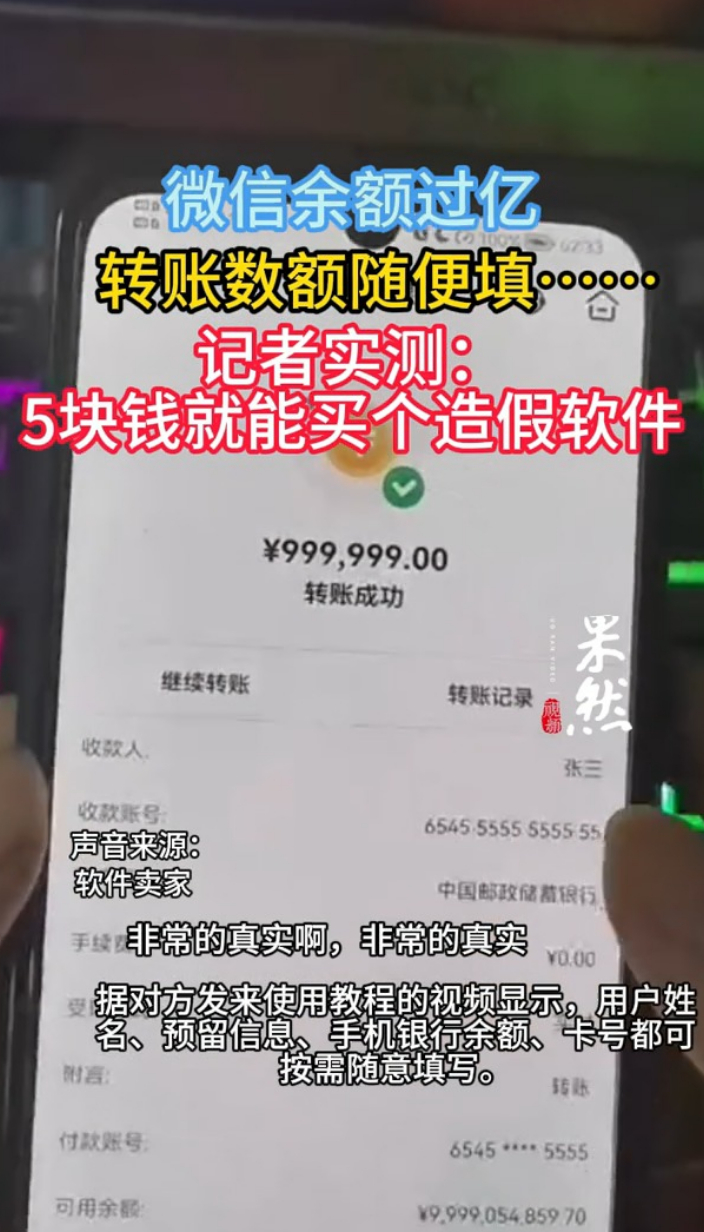 果然视频|微信余额过亿,转账数额随便填……记者实测:5块钱就能买个造假软件