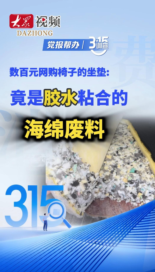 数百元网购椅子的坐垫,竟是胶水粘合的海绵废料大众新闻 昨天11:21原创近日,记者在社交平台注意到,有不少网民发帖反映,花费数百元网购的椅子拆开后,内部填充着五颜六色的拼接海绵。这些由胶水粘合的海绵“废料”坐垫,引起消费者忧心。3月份,大众新闻记者来浙江湖州安吉县,以批量采购名义暗访座椅制造企业。(大众新闻记者 张铭铭 张瑞雪)
