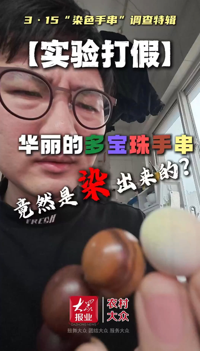 “染色手串”维权记1:华丽的多宝珠手串,是“染”出来的?大众新闻·农村大众 昨天19:28原创网络平台买的“天然多宝珠”,闻了一下我就“上头了”!这味儿太冲了!湿纸巾一擦直接掉色,酒精一碰五彩斑斓,泡进水里更是当场“卸妆”……作为一名“三农”记者,我太清楚这种化工染料意味着什么了。这戴的不是手串,是“手铐”啊!更可怕的是,同样的套路正在席卷无数县城和乡村集市。颜色越艳,越要警惕!你的手串,真的安全吗?(大众新闻·农村大众记者 李新宇)