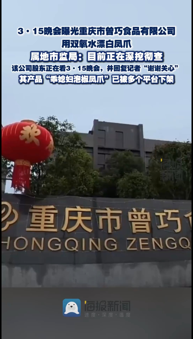 海报视讯丨3·15晚会曝光重庆市曾巧食品有限公司用双氧水漂白凤爪,属地市监局:目前正在深挖彻查