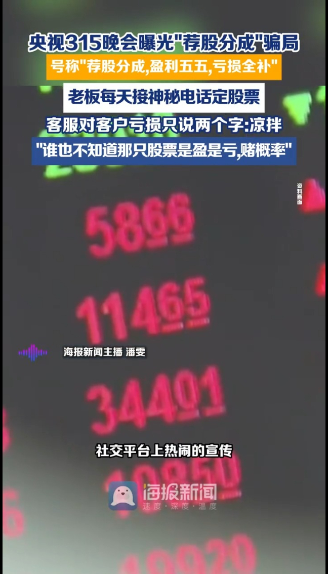 主播说|央视315晚会曝光“荐股分成”骗局 号称“荐股分成,盈利五五,亏损全补”