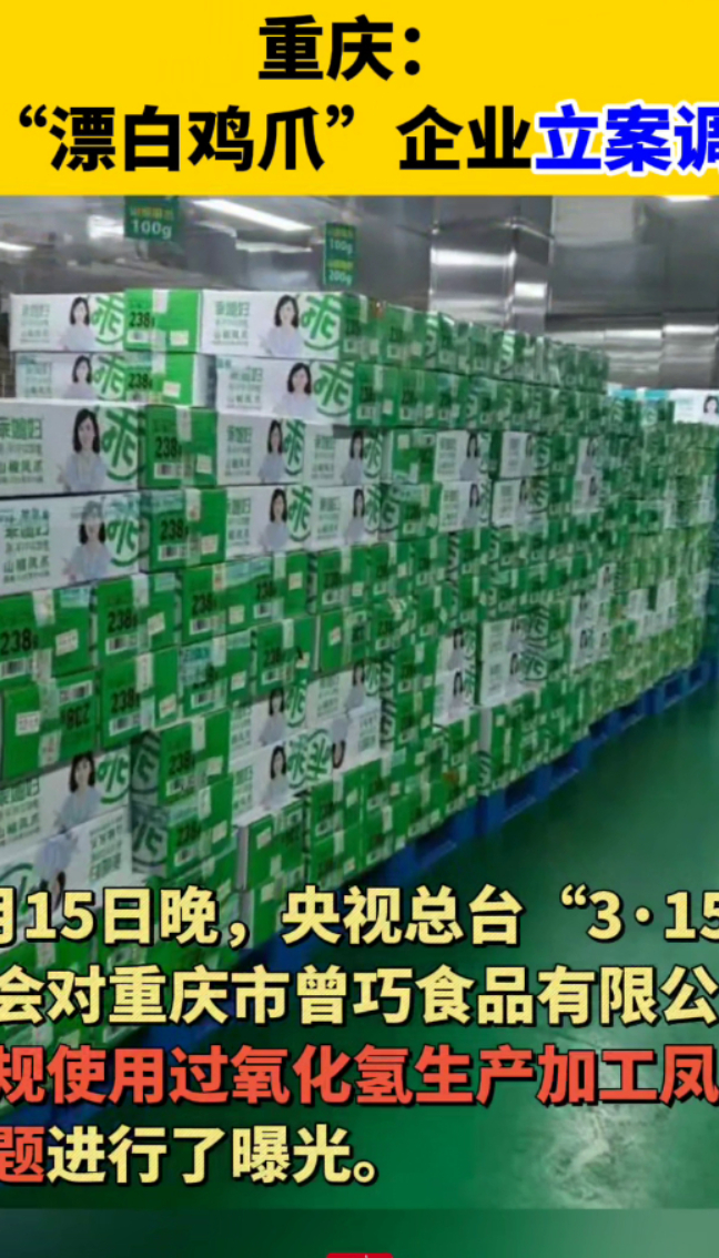 重庆:对“漂白鸡爪”企业立案调查山东法制报 | 16:11 大众新闻·山东法制报 微信扫码扫码下载客户端3月15日晚,央视总台“3·15”晚会对重庆市曾巧食品有限公司违规使用过氧化氢生产加工凤爪问题进行了曝光。重庆市市场监督管理局发布公告称:重庆市和合川区市场监管局执法人员已进驻企业接续开展深挖彻查。目前,已对该企业涉嫌违法行为立案调查,扣押涉案产品,督促企业主动召回涉案产品。