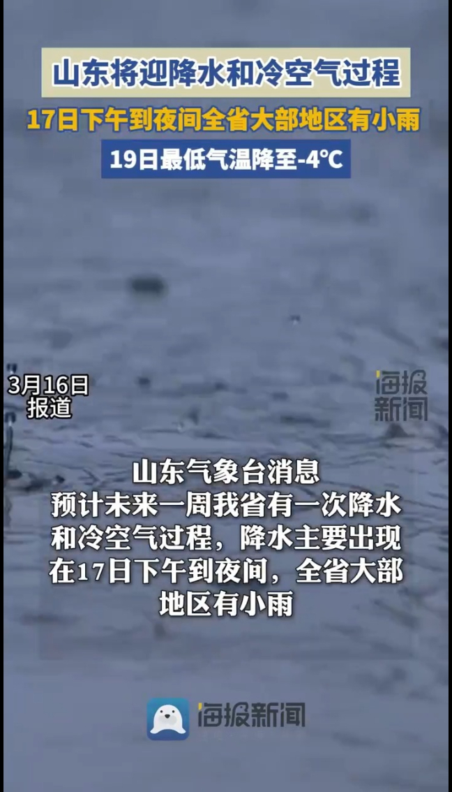 山东将迎降水降温天气,17日下午到夜间全省大部地区有小雨