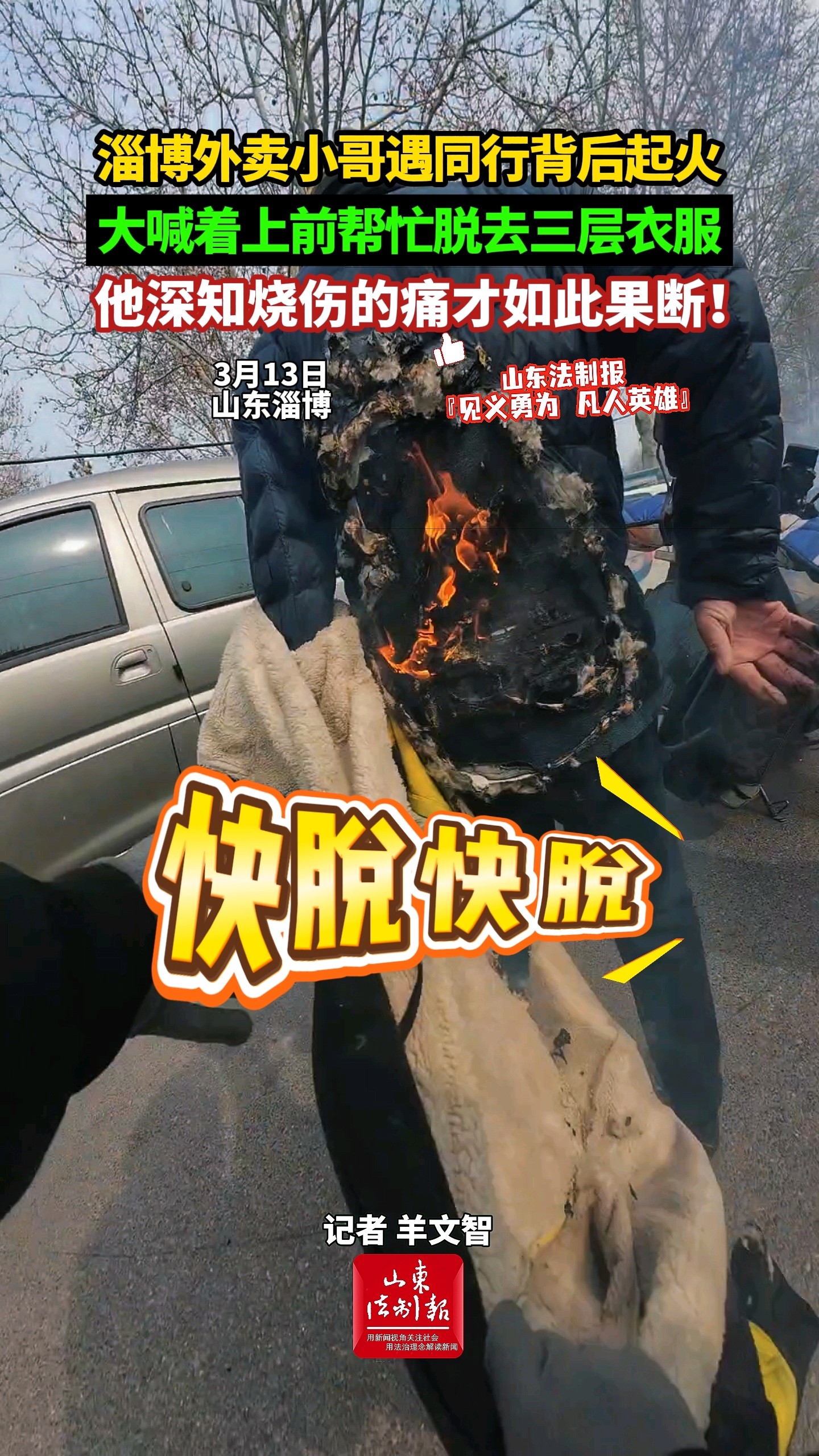 淄博外卖小哥遇同行背后起火,大喊着上前帮忙脱去三层衣服,他深知烧伤的痛才如此果断! 08:22 原创山东法制报 微信扫码扫码下载客户端他深知烧伤的痛才如此果断!3月13日,淄博周村区,外卖员许先生骑车时发现,前方一名骑手背部衣服起火而不自知,于是加速拦停,并迅速帮忙脱去着火的三层衣服,防止火烧到皮肤。记者了解到,许先生因小时候被火烧过,这次救人才如此果断。(大众新闻·山东法制报记者 羊文智)