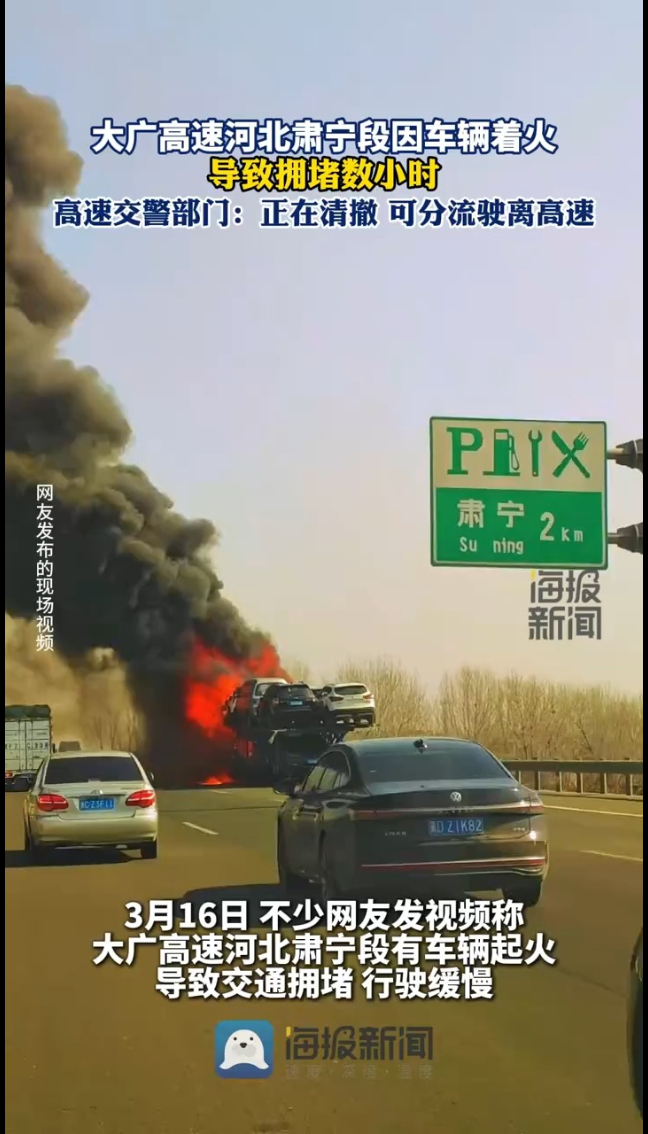 3月16日,不少网友发视频称,大广高速河北肃宁段有车辆起火,导致交通拥堵,行驶缓慢。下午3时左右,海报新闻(报料微信:HaibaoNewsSw)记者联系到河北高速交警河间大队,工作人员称现场仍在清撤中,车辆可在肃宁、曲港出口下道驶出。