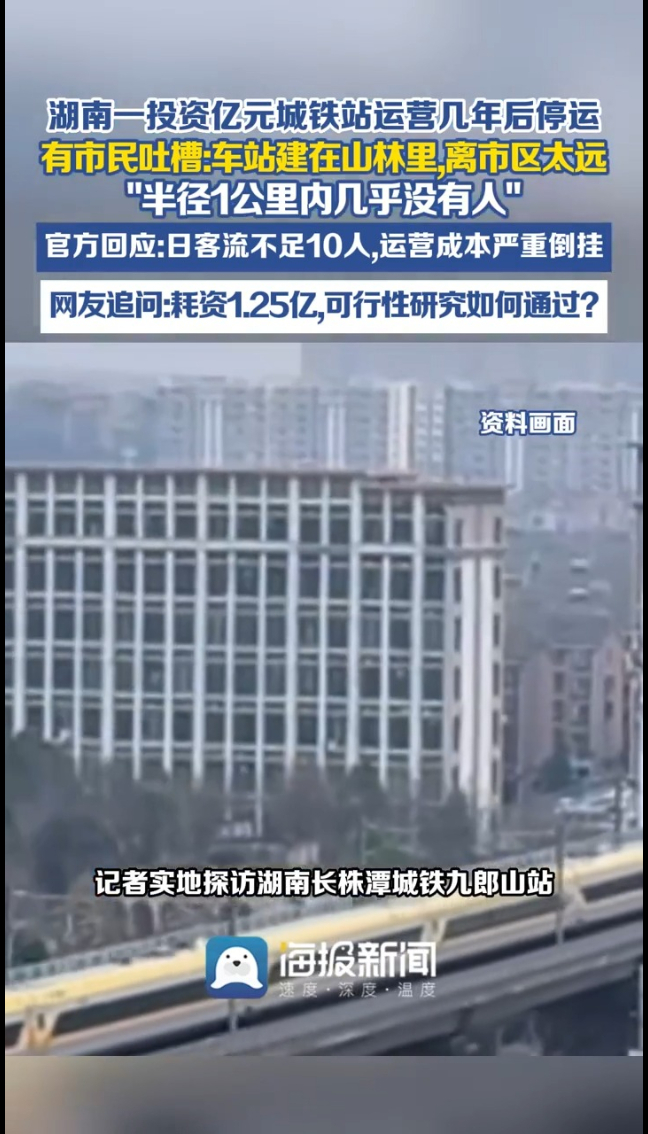 湖南城际铁路公司回应,核心问题是周边发展没跟上当初规划,重启时间至今未知数。网友灵魂拷问:1.25亿真金白银砸下去,前期可行性研究、客流评估到底怎么做的?
