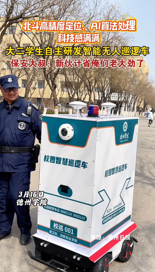 德州大二学生研制出智能校园巡逻车 “北斗定位、AI识别”科技满满大众新闻 09:35原创德州学院大二学生夏国强、刘浩、李瑞彬,在老师指导下,历时半年自主研发出校园智慧巡逻车。车辆搭载北斗高精度定位、AI算法处理等技术,科技感十足,目前已正式投入使用。(大众新闻记者 徐付彪 通讯员 苗欣 许文豪)