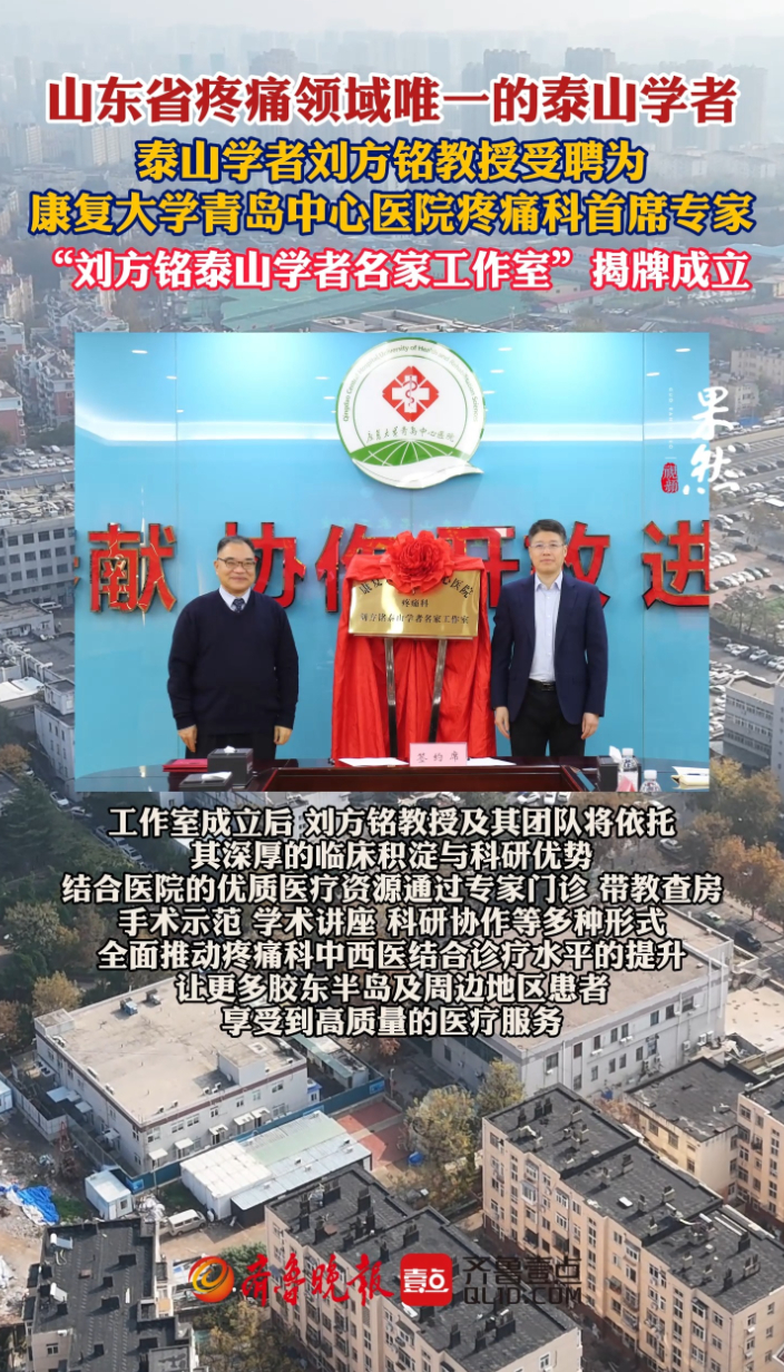 康复大学青岛中心医院“刘方铭泰山学者名家工作室”揭牌成立齐鲁晚报·齐鲁壹点客户端 10:03原创日前,康复大学青岛中心医院“刘方铭泰山学者名家工作室”成立暨特聘专家聘任仪式举行,“刘方铭泰山学者名家工作室”揭牌成立。作为山东省疼痛领域唯一的泰山学者。刘方铭教授及其团队将通过专家门诊、带教查房、手术示范、学术讲座、科研协作等多种形式,全面推动疼痛科中西医结合诊疗水平的提升。 (齐鲁晚报· 齐鲁壹点 李自强)
