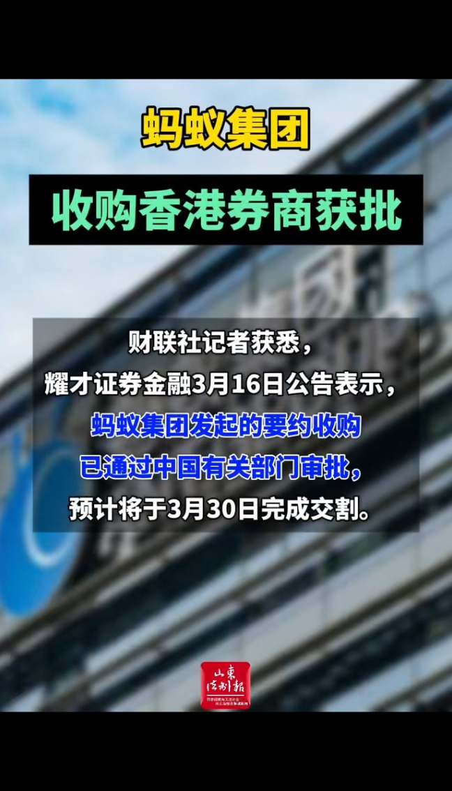 蚂蚁集团,收购香港券商获批 11:39 现场中国新闻周刊 微信扫码扫码下载客户端财联社记者获悉,耀才证券金融3月16日公告表示,蚂蚁集团发起的要约收购已通过中国有关部门审批,预计将于3月30日完成交割。这意味着,此次收购最为关键的环节目前已完成。公告也提到,公司股票于16日短暂停牌后,17日开市起将复牌。