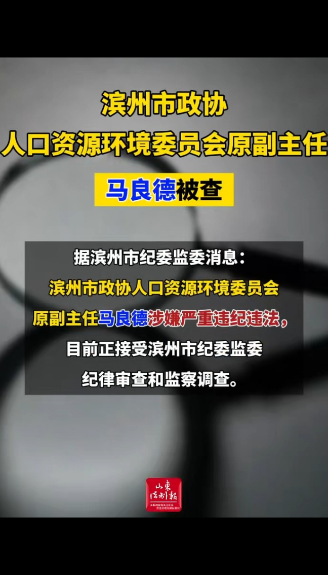 滨州市政协人口资源环境委员会原副主任马良德被查 11:38 现场大众新闻·山东法制报 微信扫码扫码下载客户端据滨州市纪委监委消息:滨州市政协人口资源环境委员会原副主任马良德涉嫌严重违纪违法,目前正接受滨州市纪委监委纪律审查和监察调查。