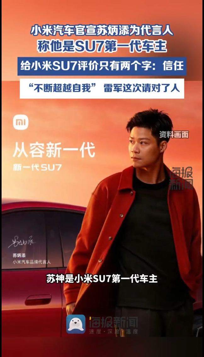 主播说 | 小米汽车官宣苏炳添为代言人 17:26 原创大众新闻·海报新闻 微信扫码扫码下载客户端小米汽车官宣品牌代言人——苏炳添!苏神是小米SU7第一代车主,在日常每一天的驾驶里,他给小米SU7的评价只有两个字,“信任”。亚洲飞人配国产好车,一个不断刷新极限,一个不断超越自我。这波代言,人车合一!(海报新闻综合小米汽车编辑黄晓荣 左晓明 潘雯 张光)