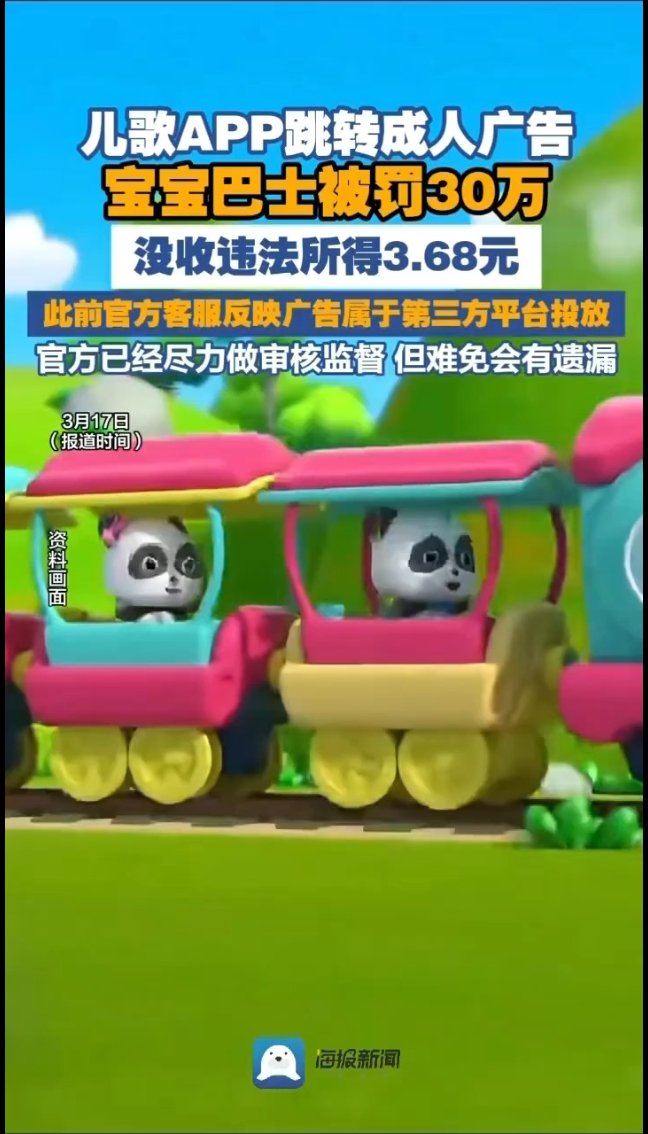 3月17日,宝宝巴士股份有限公司因在旗下儿童App中展示违背社会良好风尚的低俗广告,被处以30万元罚款,没收违法所得3.68元。3.68元,这个数字刺痛了很多人的眼睛——为了这不到一瓶水钱的收益,一家专注儿童启蒙教育的头部品牌,把低俗内容怼到了孩子眼前。