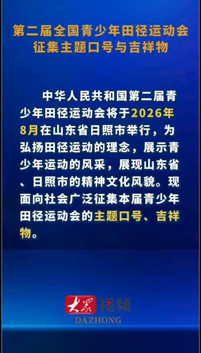 你的创意值千金!这一青少年赛事喊你设计口号和吉祥物了大众新闻 14:34原创中华人民共和国第二届青少年田径运动会将于2026年8月在山东省日照市举行。为弘扬田径运动的理念,展示青少年运动的风采,展现山东省、日照市的精神文化风貌,现面向社会广泛征集中华人民共和国第二届青少年田径运动会主题口号、吉祥物。征集时间:即日起至2026年4月15日。(大众新闻记者 丁兆霞 实习生 张新佳)