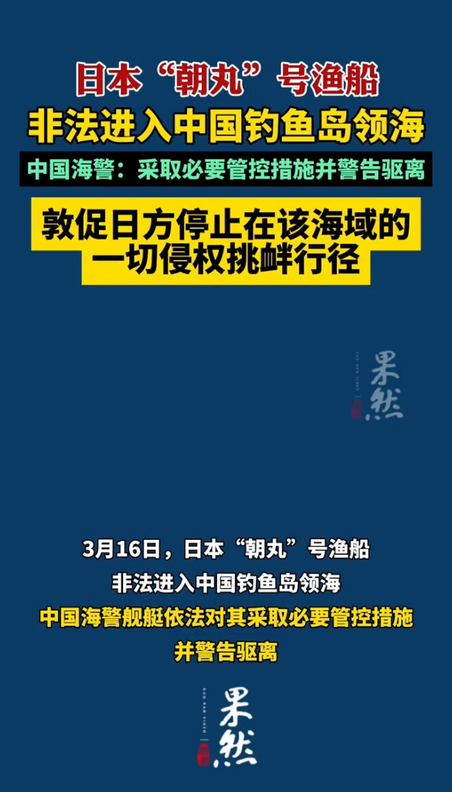 日本“朝丸”号渔船非法进入中国钓鱼岛领海,中国海警:依法对其采取必要管控措施并警告驱离,敦促日方停止在该海域的一切侵权挑衅行径