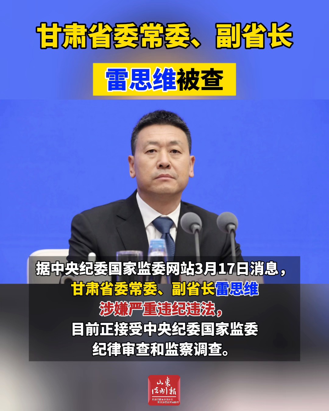 甘肃省委常委、副省长雷思维被查