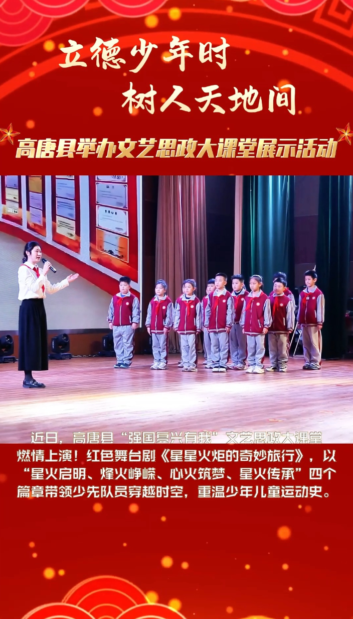 立德少年时,树人天地间——高唐县举办文艺思政大课堂展示活动大众报业·齐鲁壹点 08:52为进一步加强未成年人思想道德建设,深入推进新征程少先队“播种”工程,丰富思政教育形式,近日,高唐县教育和体育局“强国复兴有我 争当新时代好少年”文艺思政大课堂展示活动在春长小学报告厅举行。(齐鲁晚报·齐鲁壹点 唐学钰 通讯员 赵凯)