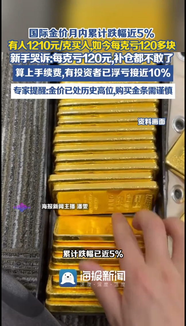 国际金价3月以来高位跳水,累计跌幅已近5%,前期追高的投资者直接被套牢。一位新手投资者告诉记者,3月2日刚入手20克投资金条,买入价高达1210元/克,如今卖出价跌至1110元/克,算上2%左右的手续费,每克净亏120多元,浮亏接近10%。更惨的是工艺金条,溢价更高,高点买入的消费者损失更严重。
