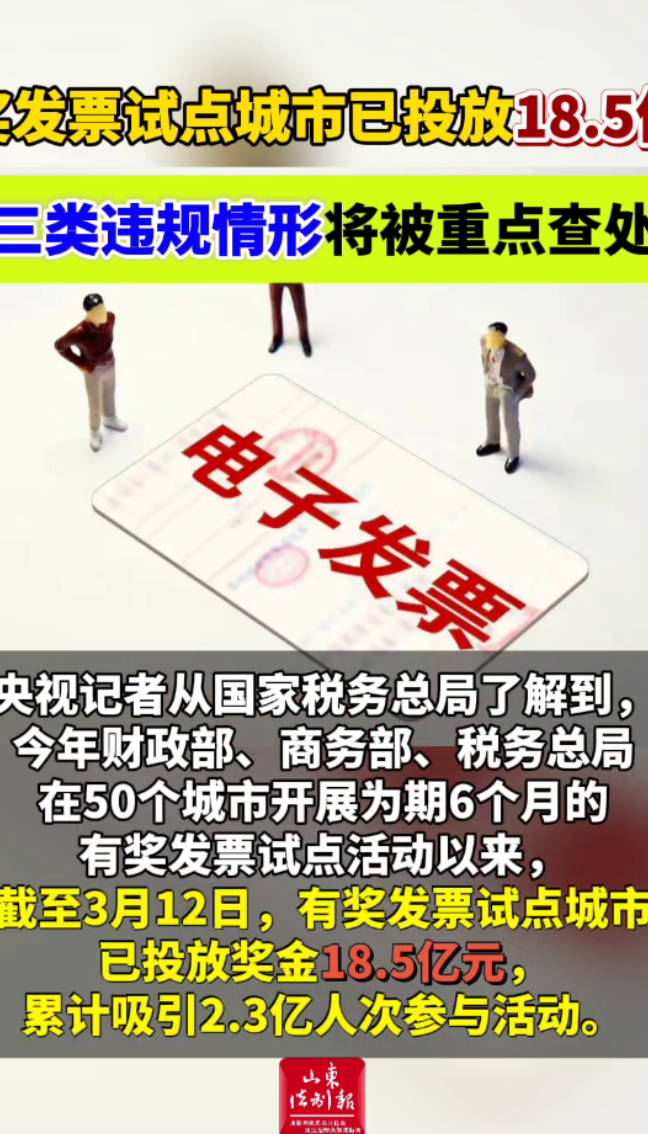 有奖发票试点城市已投放18.5亿元 三类违规情形将被重点查处 16:19 大众新闻·山东法制报 微信扫码扫码下载客户端央视记者从国家税务总局了解到,今年财政部、商务部、税务总局在50个城市开展为期6个月的有奖发票试点活动以来,截至3月12日,有奖发票试点城市已投放奖金18.5亿元,累计吸引2.3亿人次参与活动。据悉,根据相关法律法规,在有奖发票活动开展过程中,相关部门将对违规虚开发票、不合理分拆或合并开具发票,以及违规红冲发票等三类违规行为进行重点监控和查处。