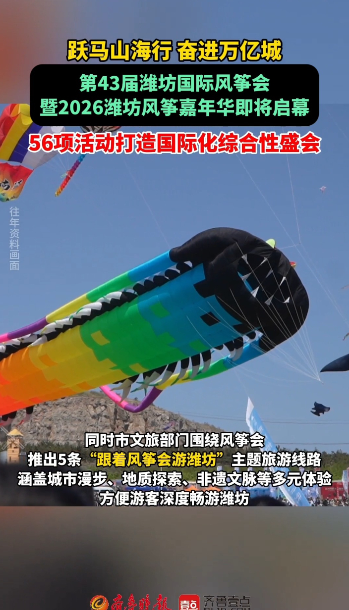 果然视频|第43届潍坊国际风筝会即将启幕大众报业·齐鲁壹点 13:363月17日,潍坊市人民政府新闻办公室召开第43届潍坊国际风筝会暨2026潍坊风筝嘉年华新闻发布会。记者在会上了解到,本届风筝会以“跃马山海行 奋进万亿城”为主题,将于4月18日盛大启幕。活动期间,将围绕多领域开展56项系列活动,园区配套设施全面升级,安丘市成立专班精细服务保障。 齐鲁晚报·齐鲁壹点 实习生 刘姝曈