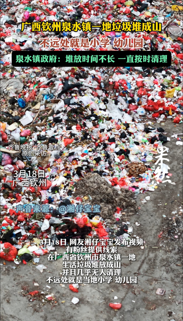 果然视频丨广西一地垃圾成山,当地:堆放时间不长,一直按时清理齐鲁晚报·齐鲁壹点客户端 15:38原创3月18日,湘仔宝宝发布视频,有粉丝提供线索,在广西钦州泉水镇一地,生活垃圾堆放成山,并且几乎无人清理,不远处就是当地小学、幼儿园。泉水镇政府工作人员表示,垃圾堆放处是垃圾中转站,垃圾堆放时间不长,一直在按时清理。(齐鲁晚报·齐鲁壹点爆料电话:0531-85193656;邮箱:405617016@qq.com)(齐鲁晚报·齐鲁壹点 刘志坤)