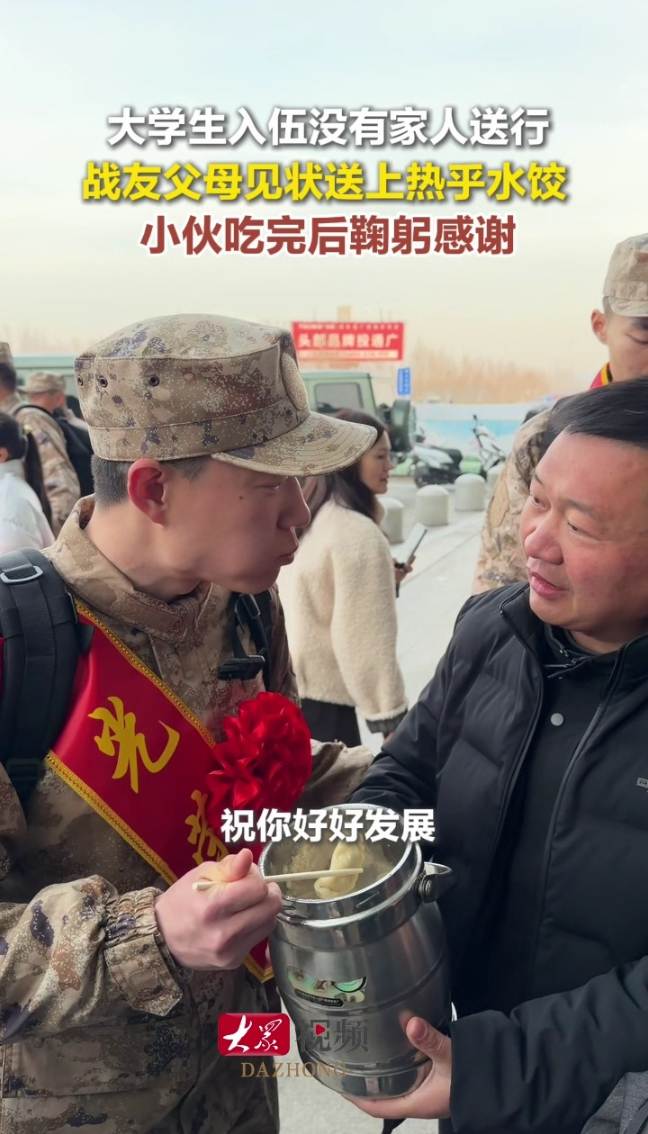 大学生入伍没有家人送行,战友父母送上热乎水饺,新兵鞠躬致谢大众新闻 11:09现场3月19日,山东德州,一名入伍出征的大学生无人送行,战友父母看到后暖心投喂水饺,小伙吃了水饺后鞠躬致谢。小伙是临沂人,在德州学院应征入伍,他表示父母过来太累,不想让他们担心。“我是一名共产党员,参军报国,无上光荣。”(大众新闻记者 贺莹莹 德州日报记者 张明凯 苗欣 王煜琪)