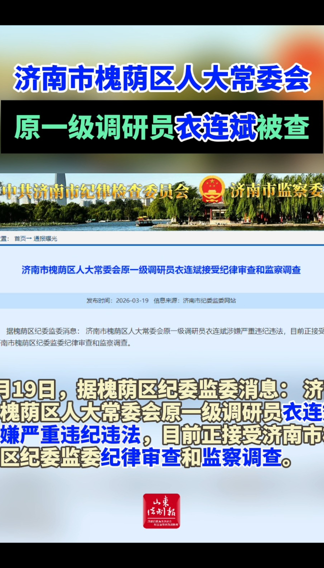 济南市槐荫区人大常委会原一级调研员衣连斌被查山东法制报 | 15:54 大众新闻·山东法制报 微信扫码扫码下载客户端3月19日,据槐荫区纪委监委消息:济南市槐荫区人大常委会原一级调研员衣连斌涉嫌严重违纪违法,目前正接受济南市槐荫区纪委监委纪律审查和监察调查。