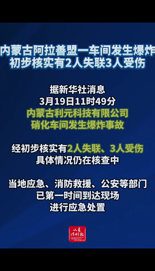 内蒙古阿拉善盟一车间发生爆炸 初步核实有2人失联3人受伤山东法制报 | 15:54 大众新闻·山东法制报 微信扫码扫码下载客户端据新华社消息,3月19日11时49分,内蒙古利元科技有限公司硝化车间发生爆炸事故,经初步核实有2人失联、3人受伤,具体情况仍在核查中。当地应急、消防救援、公安等部门已第一时间到达现场进行应急处置。