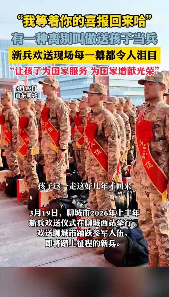 3月19日上午举行的聊城市2026年上半年新兵欢送仪式,一位新兵家长嘱咐:我等着你的喜报回来。