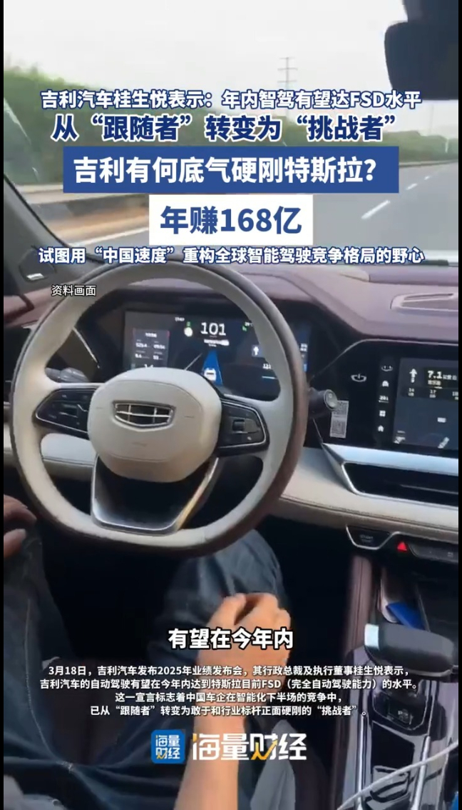 海量财经丨年内智驾达FSD水平,吉利硬刚特斯拉底气何在?