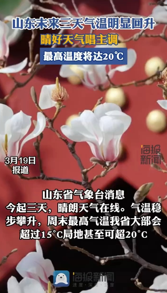 山东气象台消息:今起三天(3月19日至21日),晴朗天气在线,气温稳步攀升,到周末最高气温我省大部会超过15°C,局地甚至可超20°C。