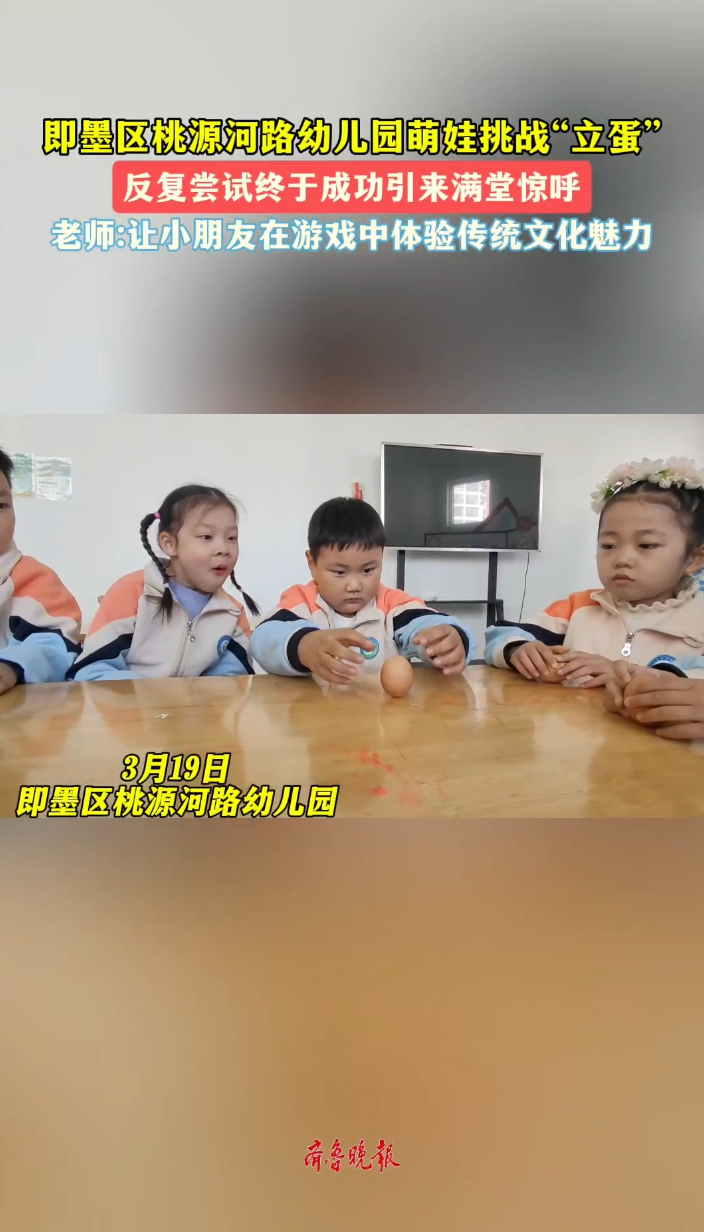 果然视频丨即墨幼儿园萌娃挑战“立蛋”,反复尝试成功齐鲁晚报·齐鲁壹点客户端 19:42原创3月19日,春分节气前夕,即墨区桃源河路幼儿园举办“春分立蛋”民俗活动。孩子们在老师指导下轻手轻脚尝试竖蛋,感受春分传统习俗,体味民俗乐趣。 (齐鲁晚报·齐鲁壹点 宋祖锋)