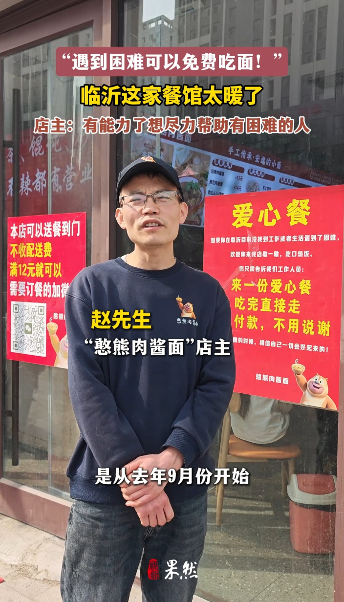 果然视频|临沂这家面馆超有爱,有困难的人可免费吃饭大众报业·齐鲁壹点 昨天21:11在临沂市工业大道与解放路交会路口西南,一家名为“憨熊肉酱面”的小店推出了“爱心餐”活动,有困难和需要帮助的人可以到店免费吃面。