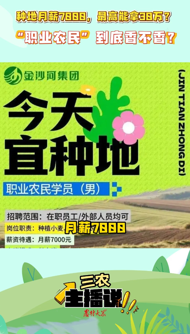 前不久,河北金沙河集团在其官方渠道发布招聘公告,以月薪7000元的待遇招聘职业农民学员,主要负责小麦、玉米种植。要求30到35周岁男性,有种地和农机操作经验的优先,而且要能接受外派。