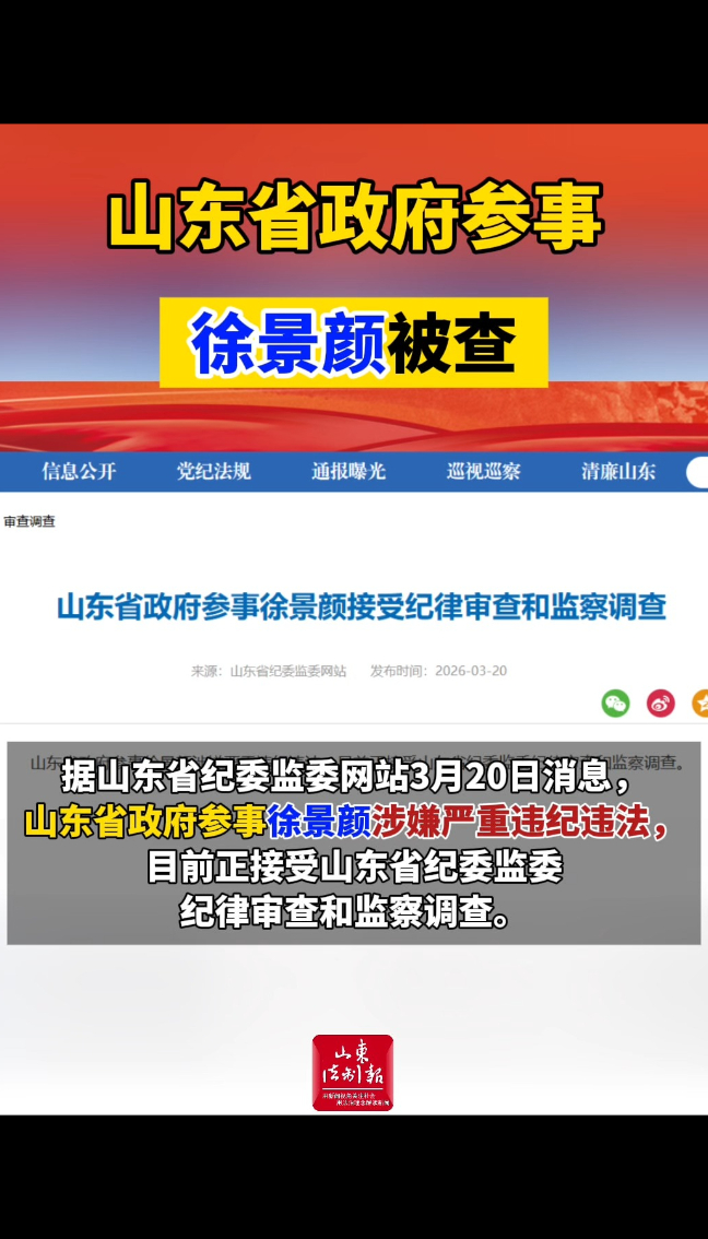 山东省政府参事徐景颜被查山东法制报 | 16:55 现场山东省纪委监委网站 微信扫码扫码下载客户端据山东省纪委监委网站3月20日消息,山东省政府参事徐景颜涉嫌严重违纪违法,目前正接受山东省纪委监委纪律审查和监察调查。