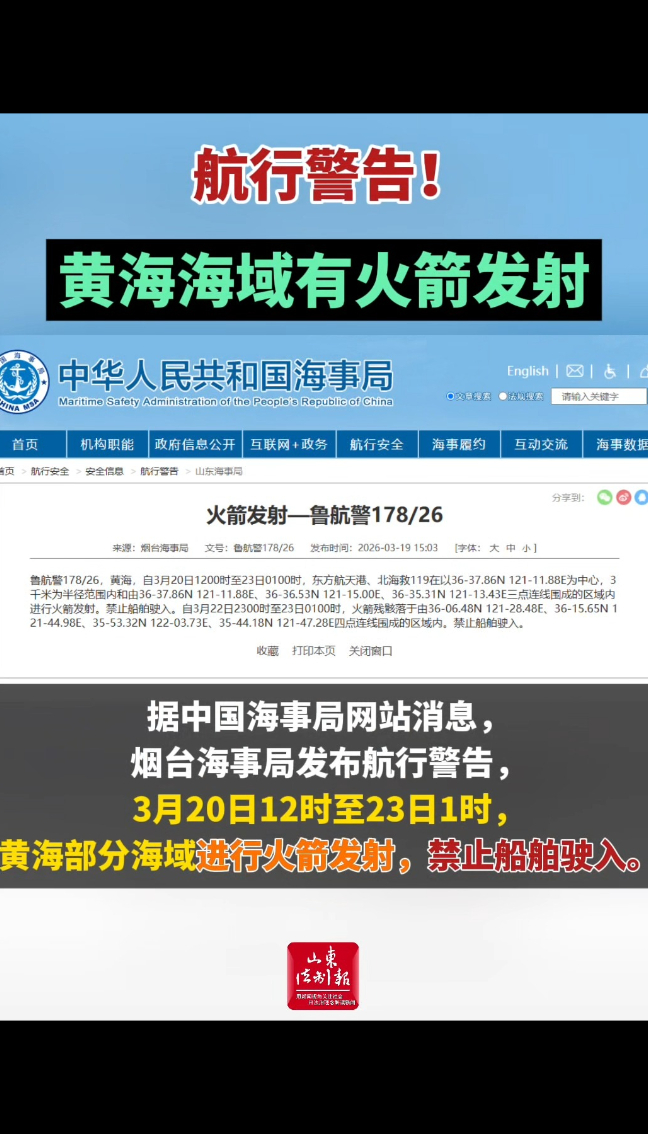 航行警告!黄海海域有火箭发射山东法制报 | 16:55 现场大众新闻·山东法制报 微信扫码扫码下载客户端据中国海事局网站消息,烟台海事局发布航行警告,3月20日12时至23日1时,黄海部分海域进行火箭发射,禁止船舶驶入。