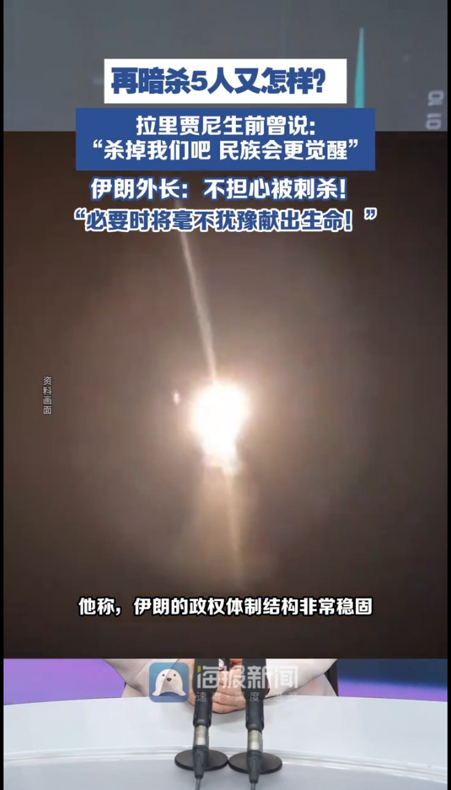 再暗杀5人又怎样?拉里贾尼生前曾说:“杀掉我们吧,民族会更觉醒”他强调:即便对方再实施五次暗杀,也无法动摇民众的意志,反而会激发更高的觉悟。多位伊朗高官遇袭身亡,伊朗外长阿拉格齐微笑表示:自己并不担心成为刺杀目标,任何伊朗人都可能成为敌人的刺杀目标。但伊朗人立场坚定,为国家目标和利益而奋斗,必要时将毫不犹豫地献出生命。他称,伊朗的政权体制结构非常稳固,即便是最高领袖牺牲了,这个体系依然可以运作,并立即推出继任者。