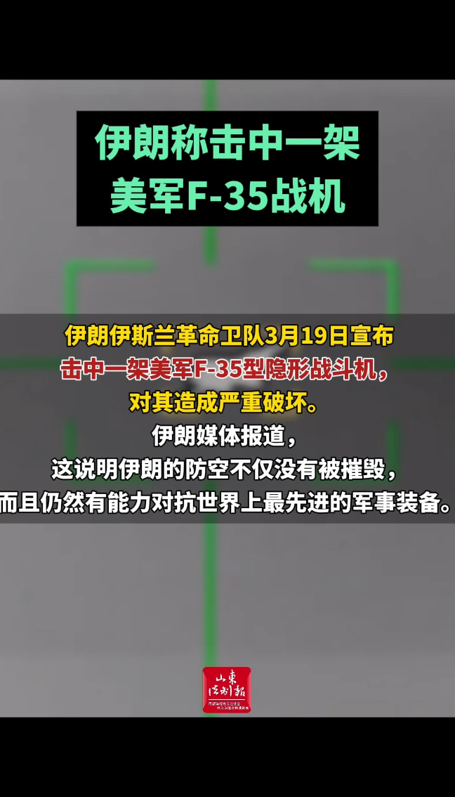 伊朗称击中一架美军F-35战机 16:54 现场新华社客户端 微信扫码扫码下载客户端伊朗伊斯兰革命卫队3月19日宣布击中一架美军F-35型隐形战斗机,对其造成严重破坏。伊朗媒体报道,这说明伊朗的防空不仅没有被摧毁,而且仍然有能力对抗世界上最先进的军事装备。据伊朗学生通讯社报道,当天凌晨2时50分左右,伊朗伊斯兰革命卫队新型先进防空系统在伊朗空域击中这架美军F-35战机。美国有线电视新闻网稍早时候报道,美军一架F-35战机疑似被伊朗火力击中后在中东地区一美军基地紧急降落。