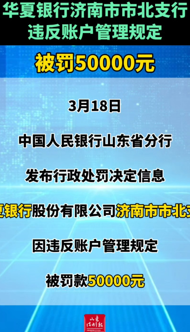 华夏银行济南市市北支行因违反账户管理规定被罚款50000元 16:53 现场大众新闻·山东法制报 微信扫码扫码下载客户端3月18日,中国人民银行山东省分行发布行政处罚决定信息,华夏银行股份有限公司济南市市北支行因违反账户管理规定,被罚款50000元。(大众新闻·山东法制报记者 屈庆春)