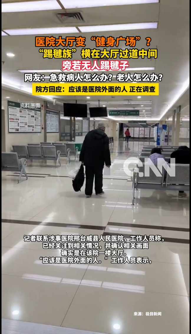 近日,河北邢台一家医院的大厅被几位老人占用踢毽子的视频引发讨论。画面中,老人们在一楼大厅的通道上运动,旁边就是“介入导管室”的标识,往来患者和家属需小心避让。这一幕,让人不禁想问:医院大厅,到底能不能这样用?